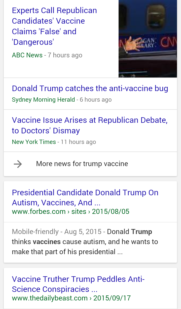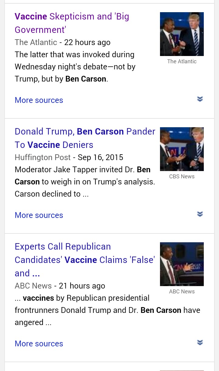 Ben Carson is CLEARLY pro-vaccine. However type in “Ben Carson, vaccination” into the magic Google machine and click on the news tab to see how the media reported on his comments from the presidential debate: