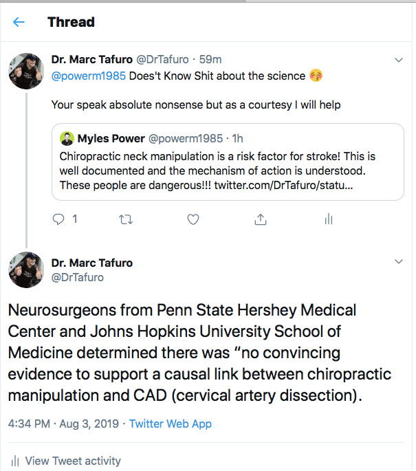 Evidence Based Chiropractor, and Devil to Subluxation only Chiropractors, Dr. Stephen Pearle, did a sufficient filet job in a letter to the editor, touching on points I said to the twitter Mob. Namely how the hell can you say a Chiropractic adjustment is associated with an arterial dissection half a month later in a country that doesn’t permit trained Chiropractors to practice?
