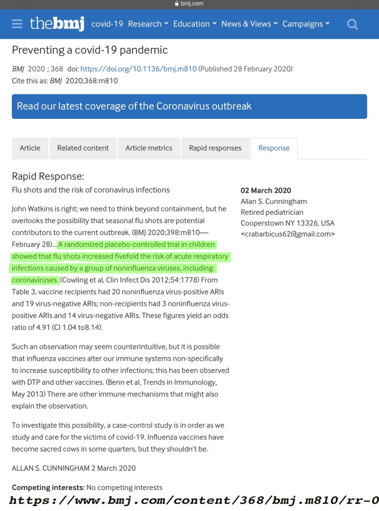 Reviewing all things Corona I came across these two anecdotes suggesting that the Flu Shot might make someone more susceptible to a Coronavirus (To be clear they are not referring to COVID-19 specifically, but to the entire family of Coronavirus), through some yet to be discovered mechanism.